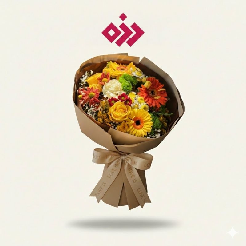 باقة بتغليف اوربي مميز تحتوي على انواع عديدة من الزهور بعدد ١٥ زهرة في الباقة