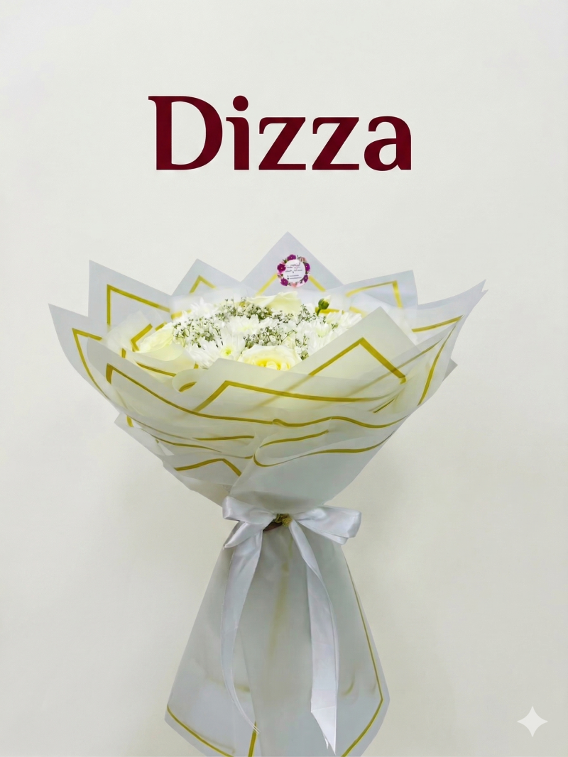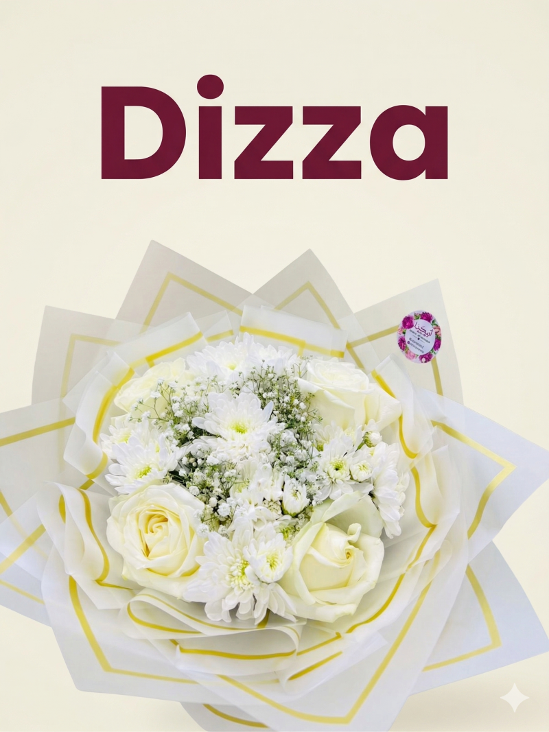 باقة ورد جوري ابيض كيني مكون من 2 غصن داوودي  4وردات جوري