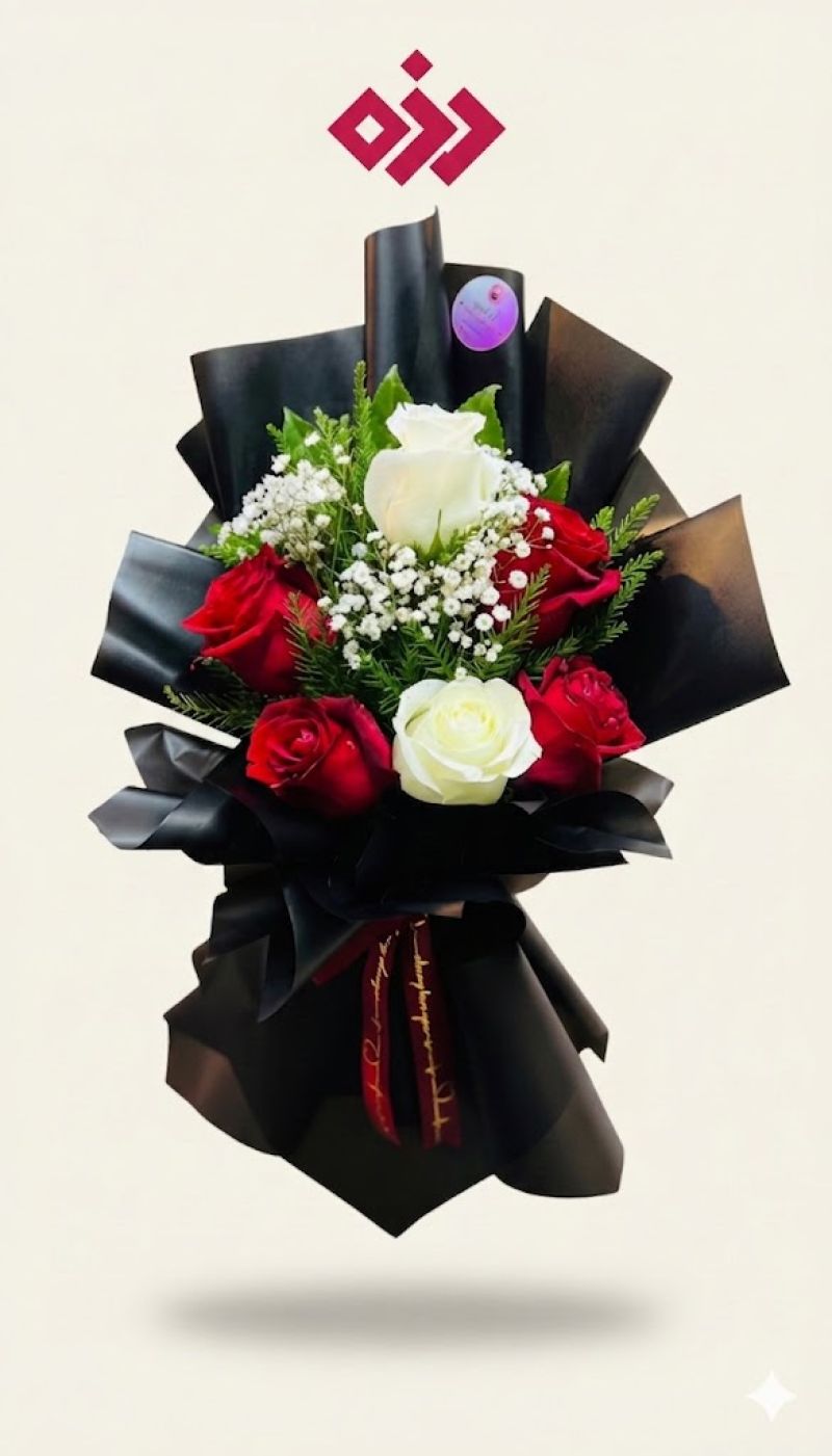 باقة ورد جوري مكونة من خمس وردات اربع وردات حمراء واثنتان بيضاء مع امكانية تغيير الود حسب طلب الزبون