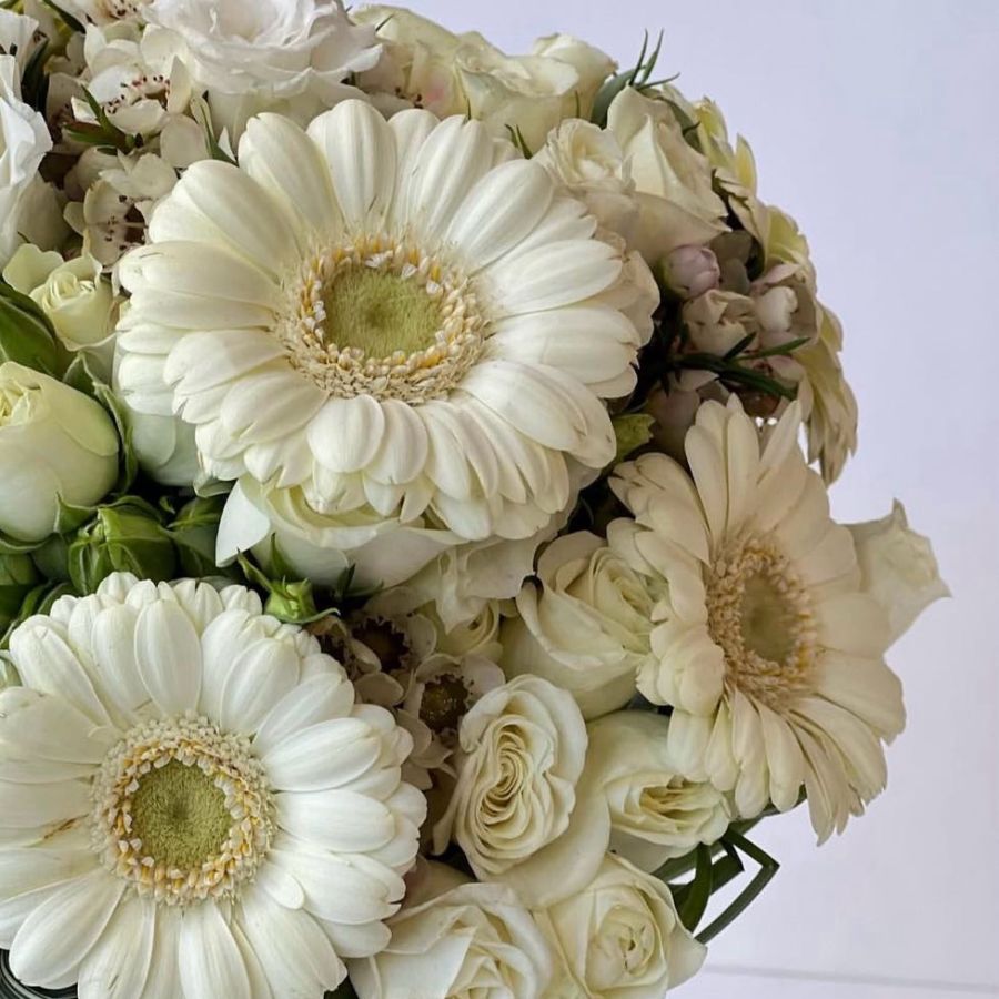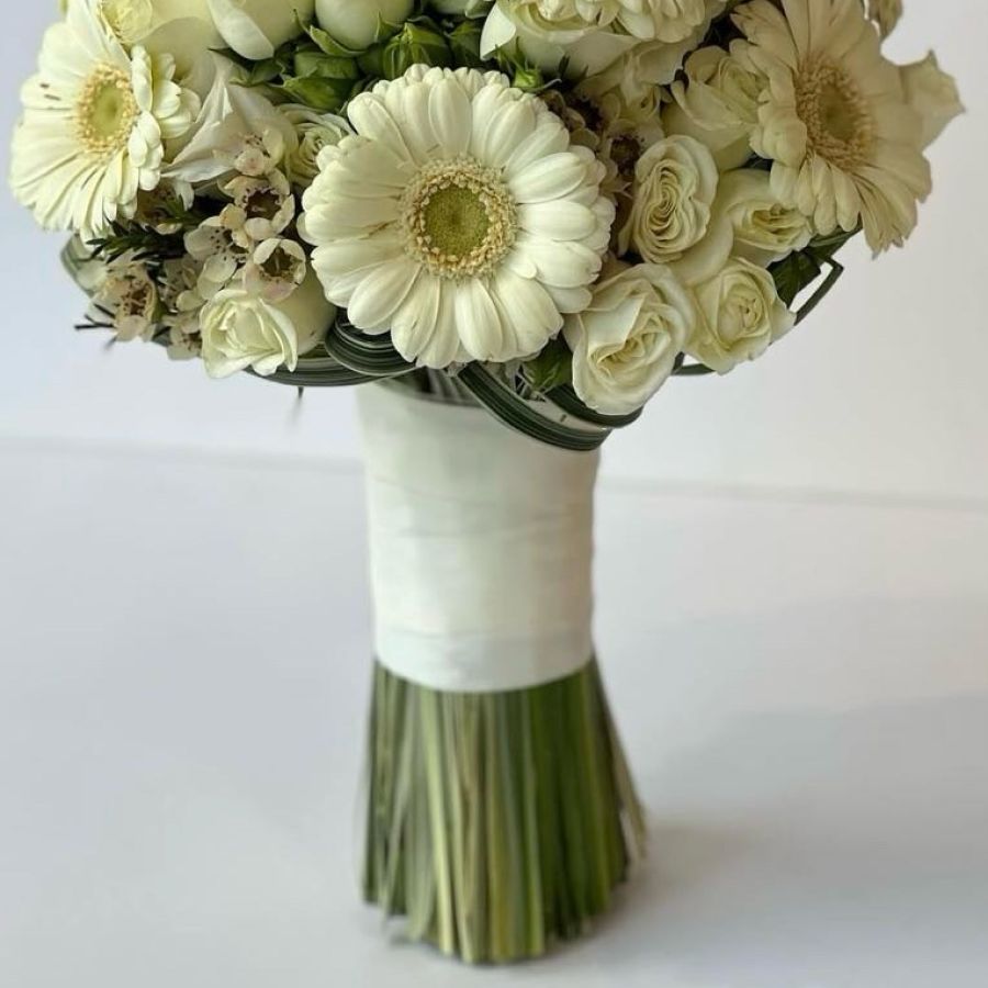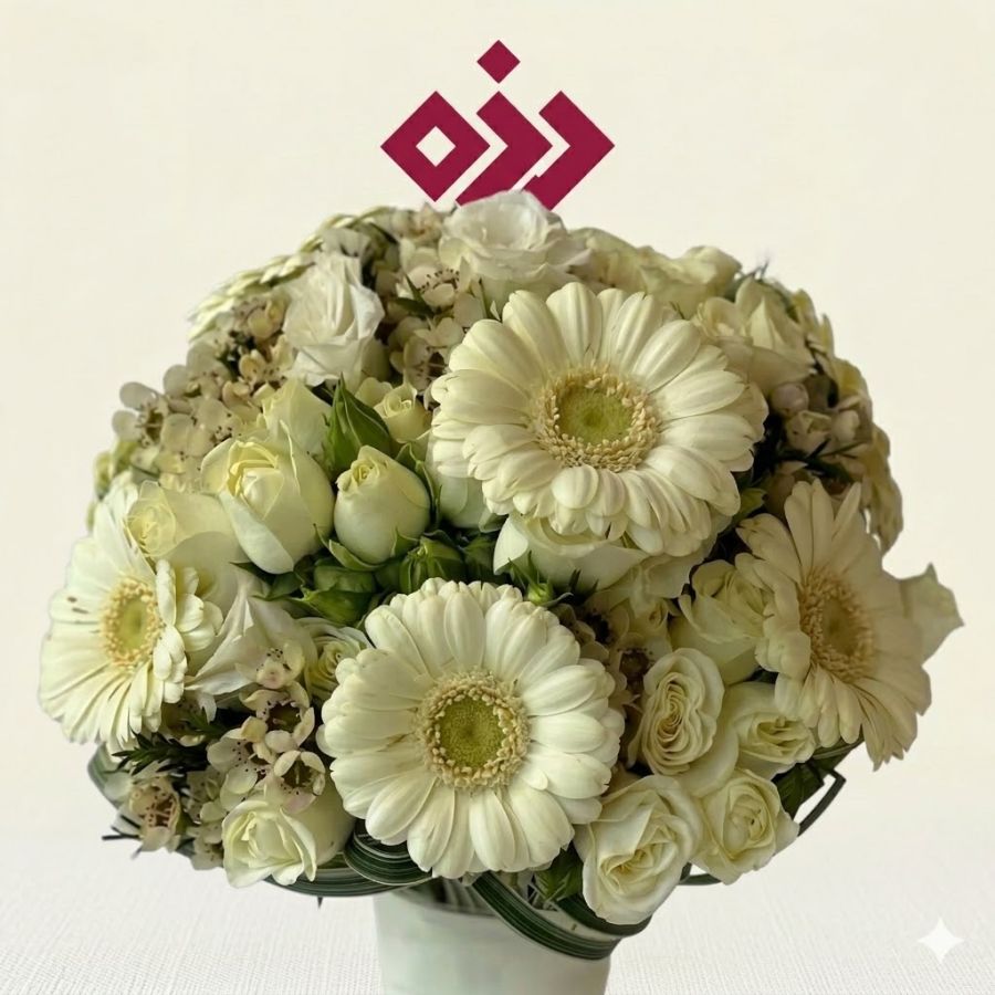 تتكون من جربيره لون ابيض بيبي روز ابيض اكسسوارات ابيض قرنفل والعديد من المستلزمات المهمه لتكون مسكة ملفتة